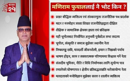 भावि पुस्ताले समेत उत्कृष्ठ लाभ उठाउँन सक्ने भिजन भएका विकास प्रेमि फुयाललाई दिईएको मतदानले हामी सबैको समस्या सम्बोदन हुँने हुँदा अनिवार्य रुपमा मणिराम फुयाललाई मतदान गरी आफ्नो हकहितलाई सुनिश्चत गरौ।