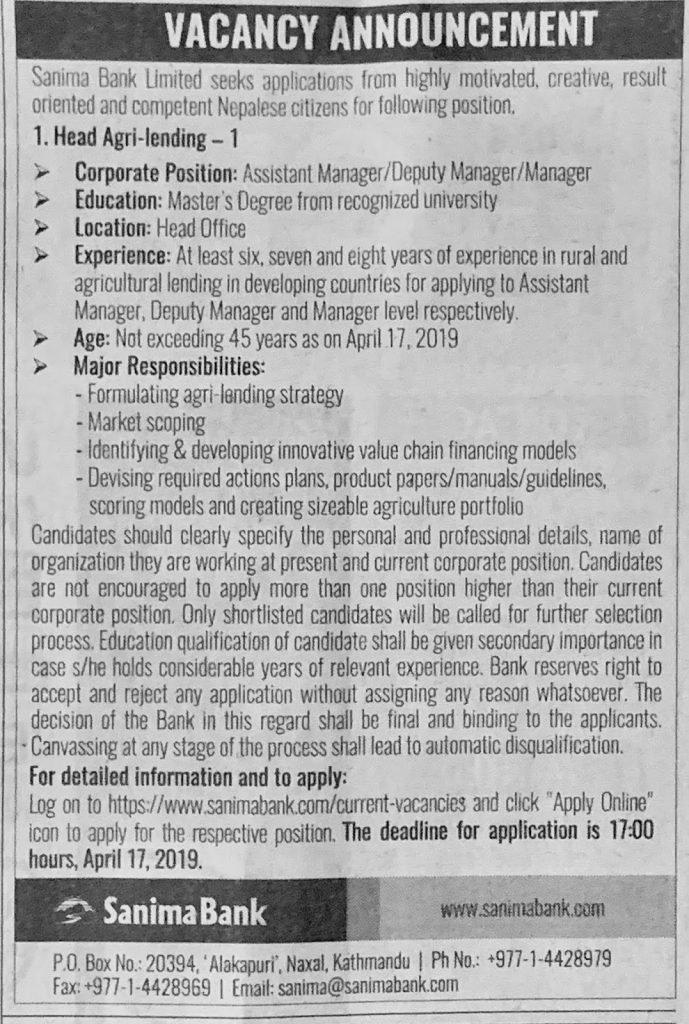नारीकोसिस डटकम । नारीकोसिस डटकम । सानिमा बैंकले विभिन्न पदमा कर्मचारी माग गरेको छ । बैंकले कार्पोरिट पोजिशनका लागि असिस्टेन्ट म्यानेजर, डेपोटि म्यानेजर र म्यानेजर पदका लागि कर्मचारी मागको आह्वान गरेको हो ।
