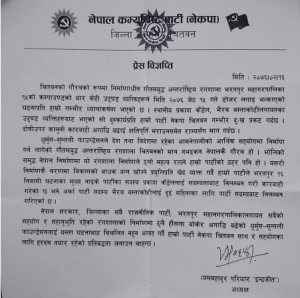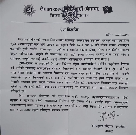 नेकपा चितवनले दोषीउपर कारर्वाही गरी क्षतिपूर्ती उनीहरुबाट नै भराउन माग पनि गरेको छ । यस्ता घटनाबाट विचलित नभएर निर्माणको काममा अघि बढ्न नेकपा चितवनले विज्ञप्ती मार्फत फाउण्डेशनलाई आग्रह गरेको छ ।