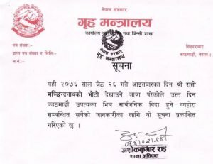 गृह मन्त्रालयले शुक्रवार विज्ञप्ति निकालेर आइतबार रातो मछिन्द्रनाथको भोटो देखाउने जात्रा परेकाले सार्वजनिक विदा हुने जानकारी गराएको हो।
