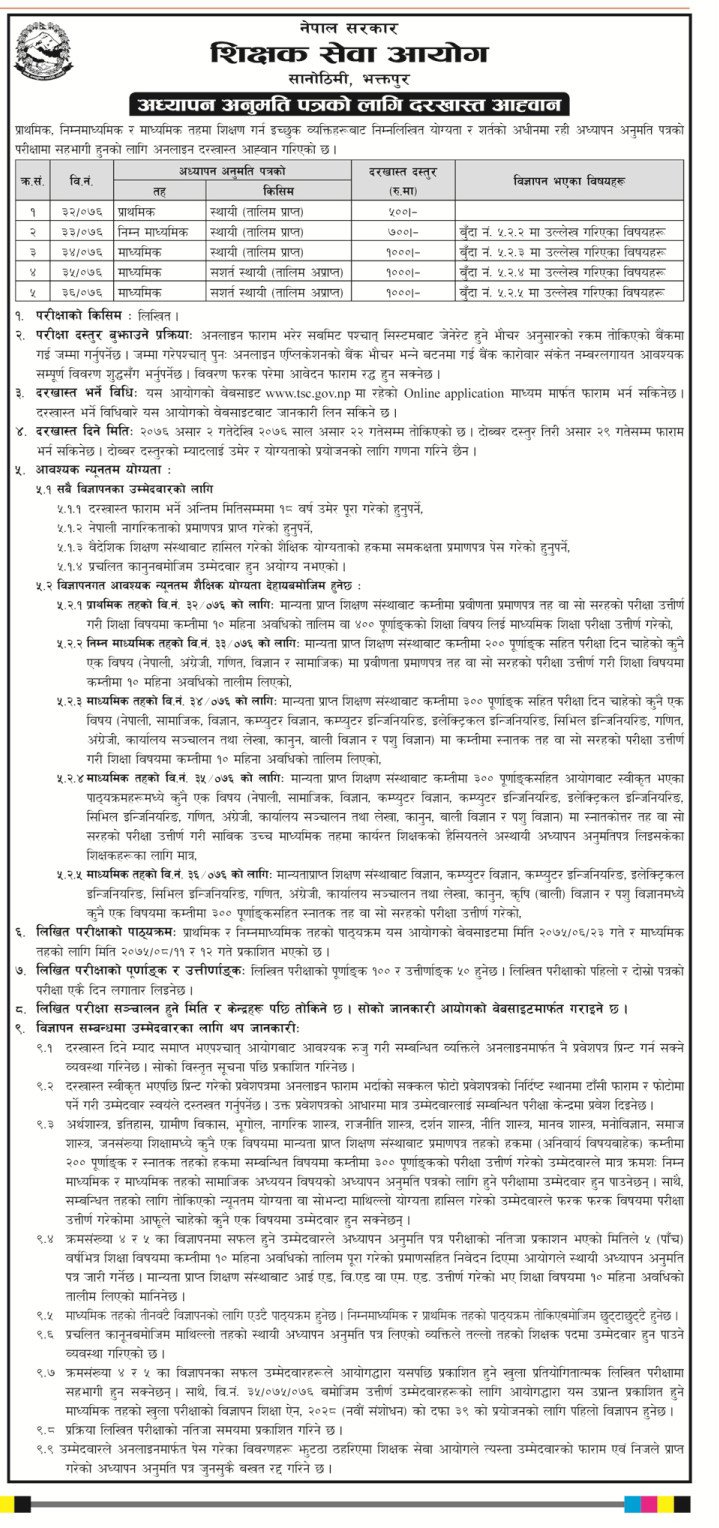 आयोगले एक सूचना जारी गर्दै प्राथमिक, निम्न माध्यामिक र माध्यामिक तहमा शिक्षण गर्न इच्छुकको लागि दरखास्त आह्वान गरिएको जनाइएको छ ।