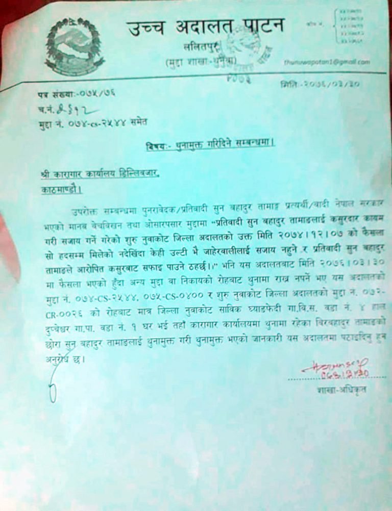 नारीकोसिस डटकम/साउन १, नुवाकोट । वेचविखनको अभियोगमा प्रक्राउ परेका नुवाकोट दुप्चेश्वर गाउँपालिका–१ का वडाअध्यक्ष सुनबहादुर तामाङ उच्च अदालत पाटनको आदेशमा रिहा भएका छन् । उच्च अदालत पाटनका न्यायाधीश रमेशबहादुर थापा र हरिप्रसाद केसीको संयुक्त इजलासले जिल्ला अदालतको फैसला उल्ट्याउँदै तामाङलाई सफाइ दिने फैसला गरेको हो । उनी २०६८ सालको एउटा मुद्दामा फरार रहेको तथ्य फेला परेपछि सिविआईले २०७४ माघ ५ गते शुक्रवार काठमाडौं जिल्ला अदालतमा वयानका लागि उपस्थित गराएपछि अदालतले उनलाई ८ लाख रुपैया धरौटीमा रिहा गर्न आदेश दिएको थियो । तर उनि पुन पक्राउ परेका थिए ।