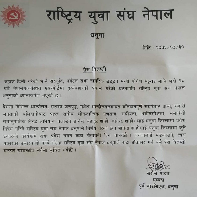नारीकोसिस डटकम/भदौ ३०, धनुषा । सत्तारुढ दल नेपाल कम्युनिष्ट पार्टी (नेकपा) को भ्रातृ संगठन राष्ट्रिय युवा संघ नेपाल धनुषाले आइतबार विज्ञप्ति जारी गर्दै ज्ञानेन्द्र शाहीलाई प्रवेश निषेध घोषणा गरेको हो ।
