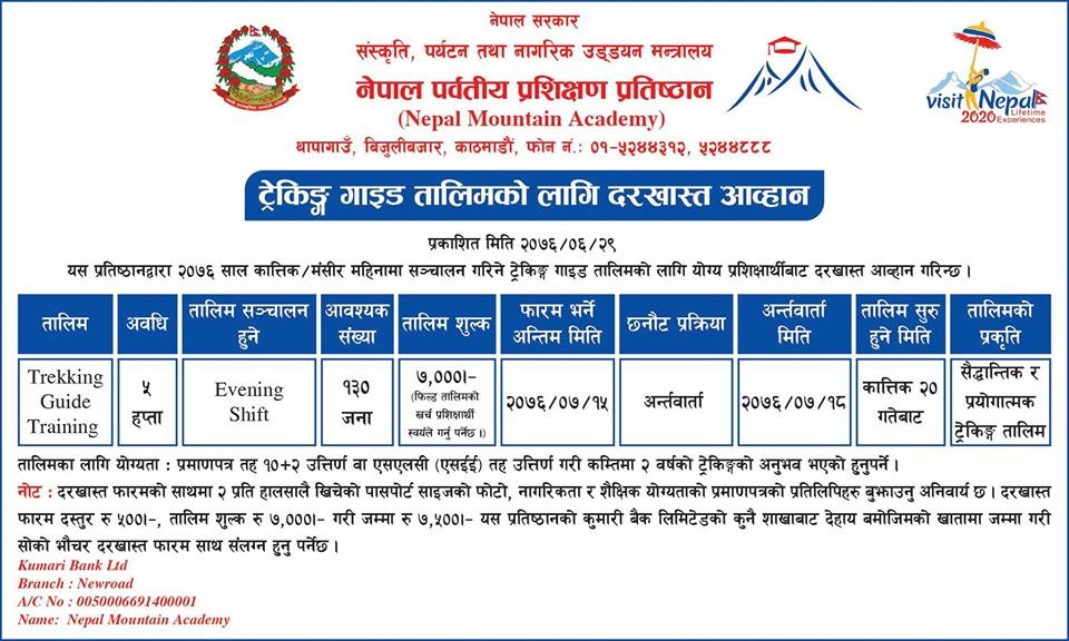 नारीकोसिस डटकम कात्तिक १५, काठमाडौंं । नेपाल माउन्टेन एकेडेमी (एनएमए) थापागाउँ, बिजुलीबाजारले शैक्षिक वर्ष २०७६ को ट्रेकिङ्ग गाईड कोर्सका लागि आवेदन खुलाको घोषणा गरेको छ । यो कोर्ष गरेर सहजै स्वरोजगार बन्न सकिनेछ । जसको लागि पास गरेको हुनुपर्नेछ । नेपाल माउन्टेन एकेडेमी (एनएमए) नेपाल सरकारको सरकारी निकाय हो । सूचना हेुर्नहोस् ।