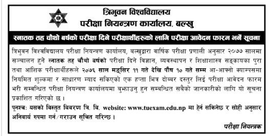 त्रिभुवन विश्वविद्यालय परीक्षा नियन्त्रण कार्यालय, बल्खुद्वारा वार्षिक परीक्षा प्रणाली अनुसार २०७७ सालमा सञ्चालन हुने स्नातक तह चौथो बर्षको परीक्षा दिने विज्ञान, व्यवस्थापन र शिक्षाशास्त्र सङ्कायका पुरा तथा आंशिक परीक्षार्थीहरूले २०७६ साल मङ्सिर ११ गते देखि पौष १० गते सम्म आ–आफ्नो क्याम्पसमा नियमित शुल्कमा र साधारण म्याद सकिएको एक हप्ता भित्र दोब्बर दस्तुर लिई परीक्षा आवेदन फारम भरी सम्बन्धित परीक्षा नियन्त्रण कार्यालयमा बुझाउनु हुन सम्बन्धित सबैको जानकारीको लागि सूचना प्रकाशित गरेको छ ।