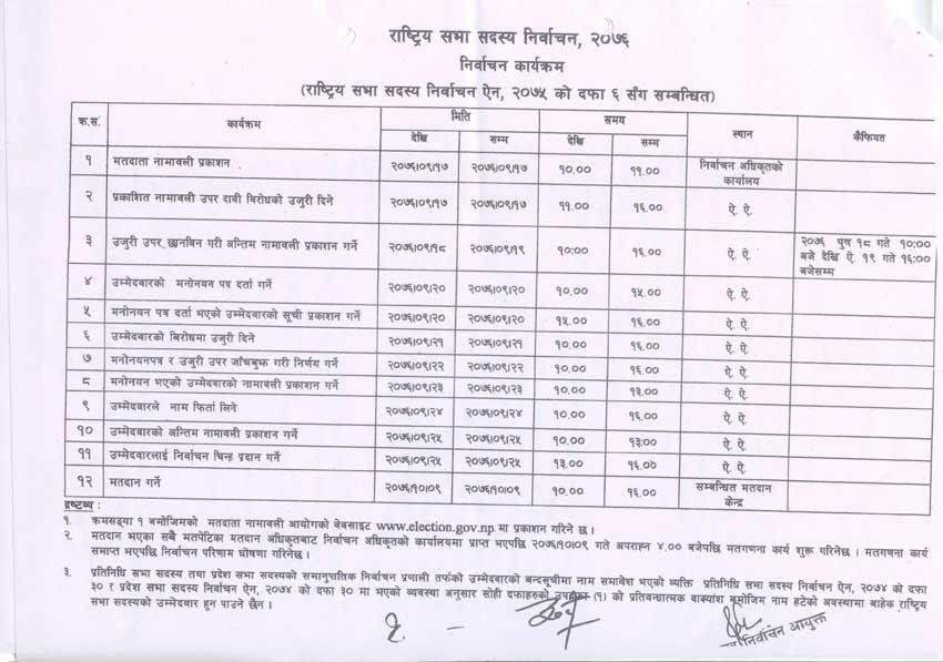 नारीकोसिस डटकम पुस २, काठमाडौं । निर्वाचन आयोगले राष्ट्रियसभा सदस्य निर्वाचनको कार्यतालिका सार्वजनिक गरेको छ ।