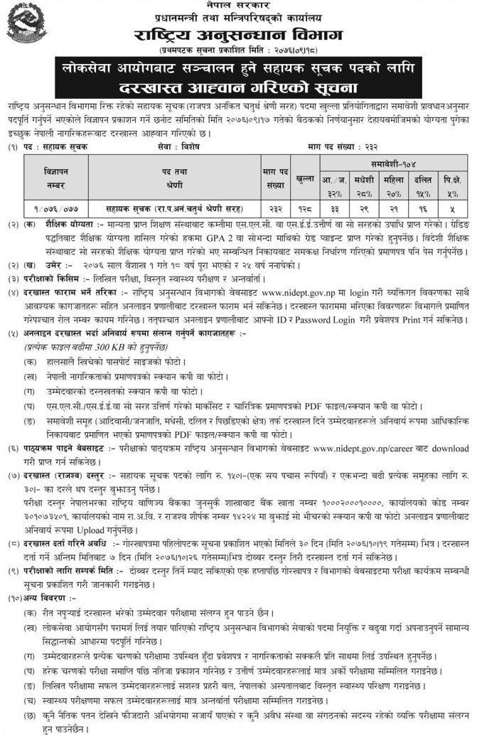 सरकारी जागीर खुल्यो, राष्ट्रिय अनुसन्धान विभागले माग्यो २३२ सहायक सूचक,एसएलसी पासले पनि आवेदन दिनसक्ने