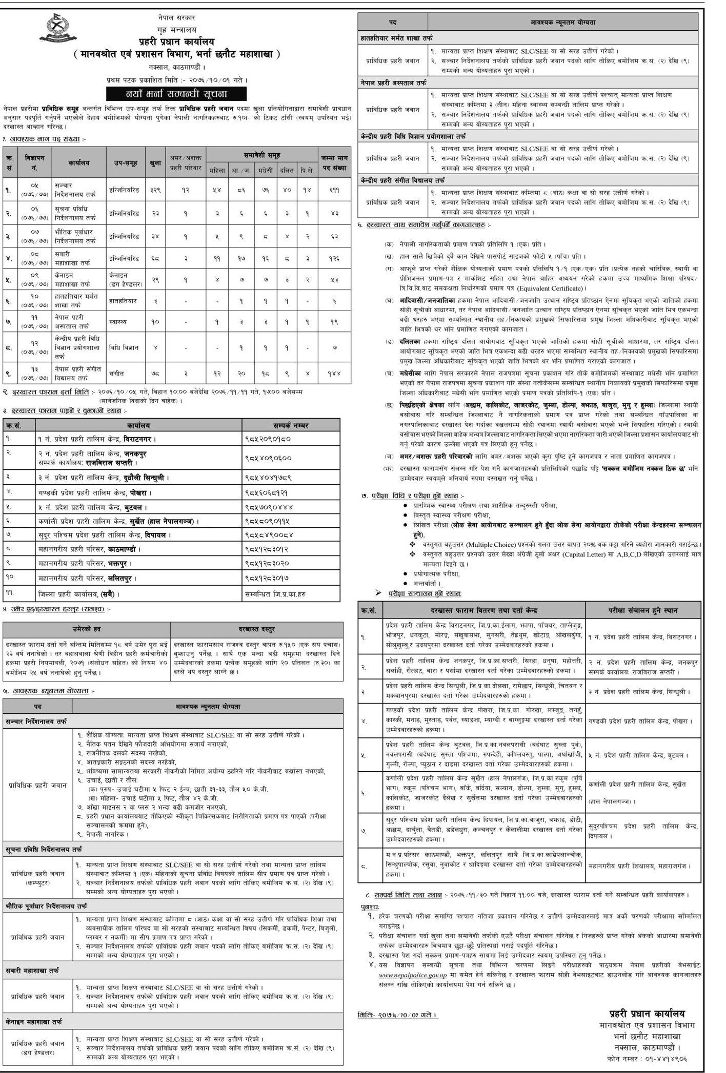 प्रहरी प्रधान कार्यालयका अनुसार इन्जिनियरिङ, केनाइन, हातहतियार, स्वास्थ्य, विज्ञान प्रविधि र संगीत उपसमूहमा दरखास्त आह्वान भएको हो । पदपूर्ति समावेशी प्रावधानअनुसार गरिने सूचनामा उल्लेख छ ।