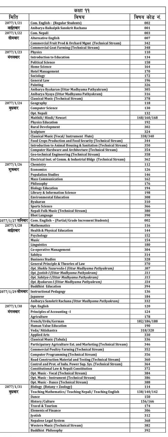 नारीकोसिस डटकम/माघ ८, काठमाडौं । राष्ट्रिय परीक्षा बोर्डले कक्षा ११ र १२ को वार्षिक परीक्षा तालिका सार्वजनिक गरेको छ । तालिका अनुसार कक्षा १२ को परीक्षा २०७७ बैशाख ८ गते देखि सुरु हुने भएको छ भने कक्षा ११ को परीक्षा २०७७ बैशाख २१ गते देखि सुरु हुने भएको छ । परीक्षा बिहान ७ बजेदेखि १० बजेसम्म सञ्चालन हुने छ ।
